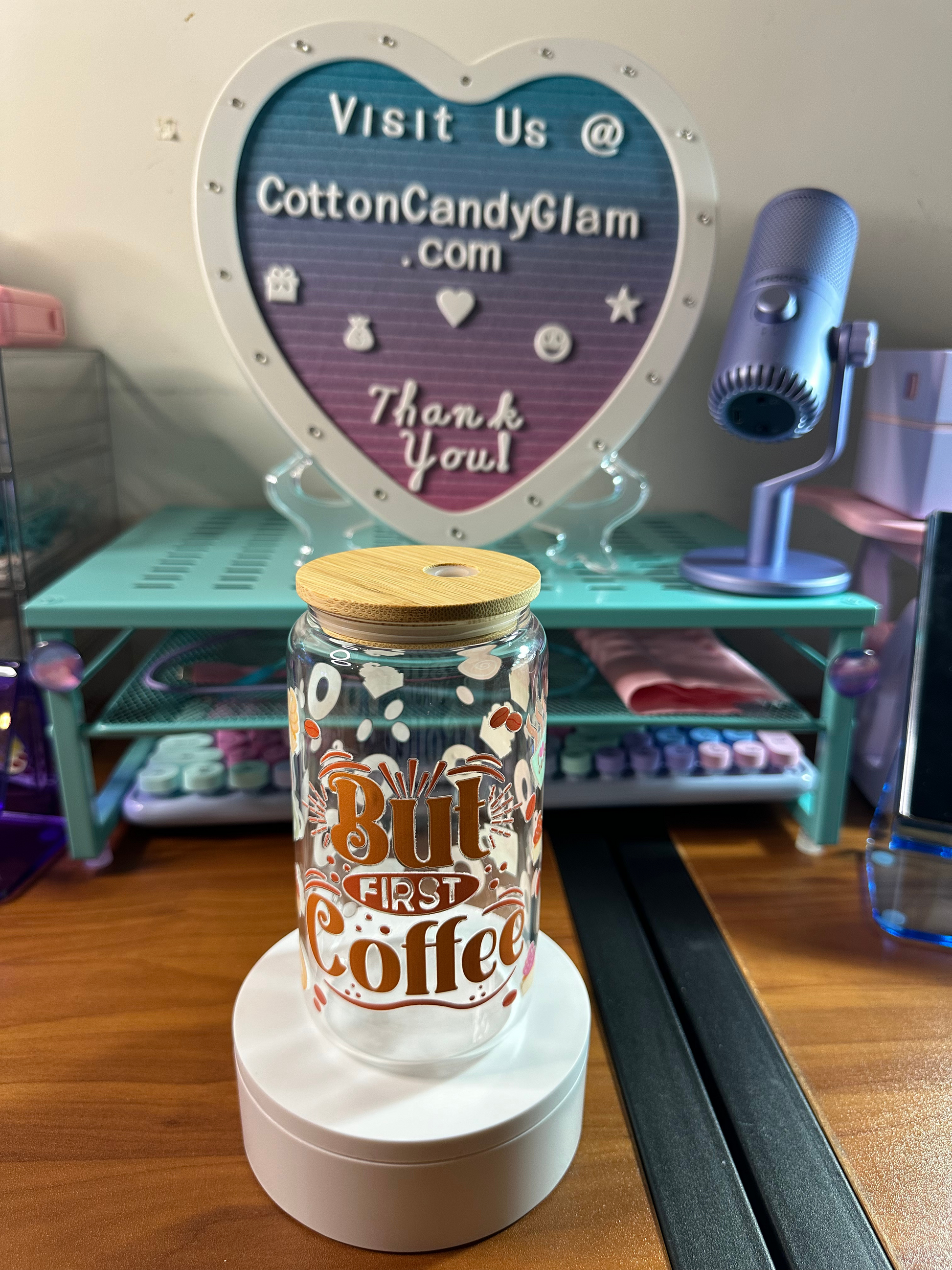 The But First, Coffee Glass Cup is here to remind you what really matters in the morning—coffee! Holding 16 ounces of your favorite caffeinated (or decaf) beverage, this charming cup features a fun and vibrant design that’s perfect for all coffee lovers. With its bamboo lid and glass straw, it’s a stylish and eco-friendly way to enjoy your morning brew or iced coffee. The design is applied using a high-quality UVDTF transfer, making it waterproof, permanent, and ready for daily use. This cup is your perfect companion for starting your day off right—because, well, coffee comes first!