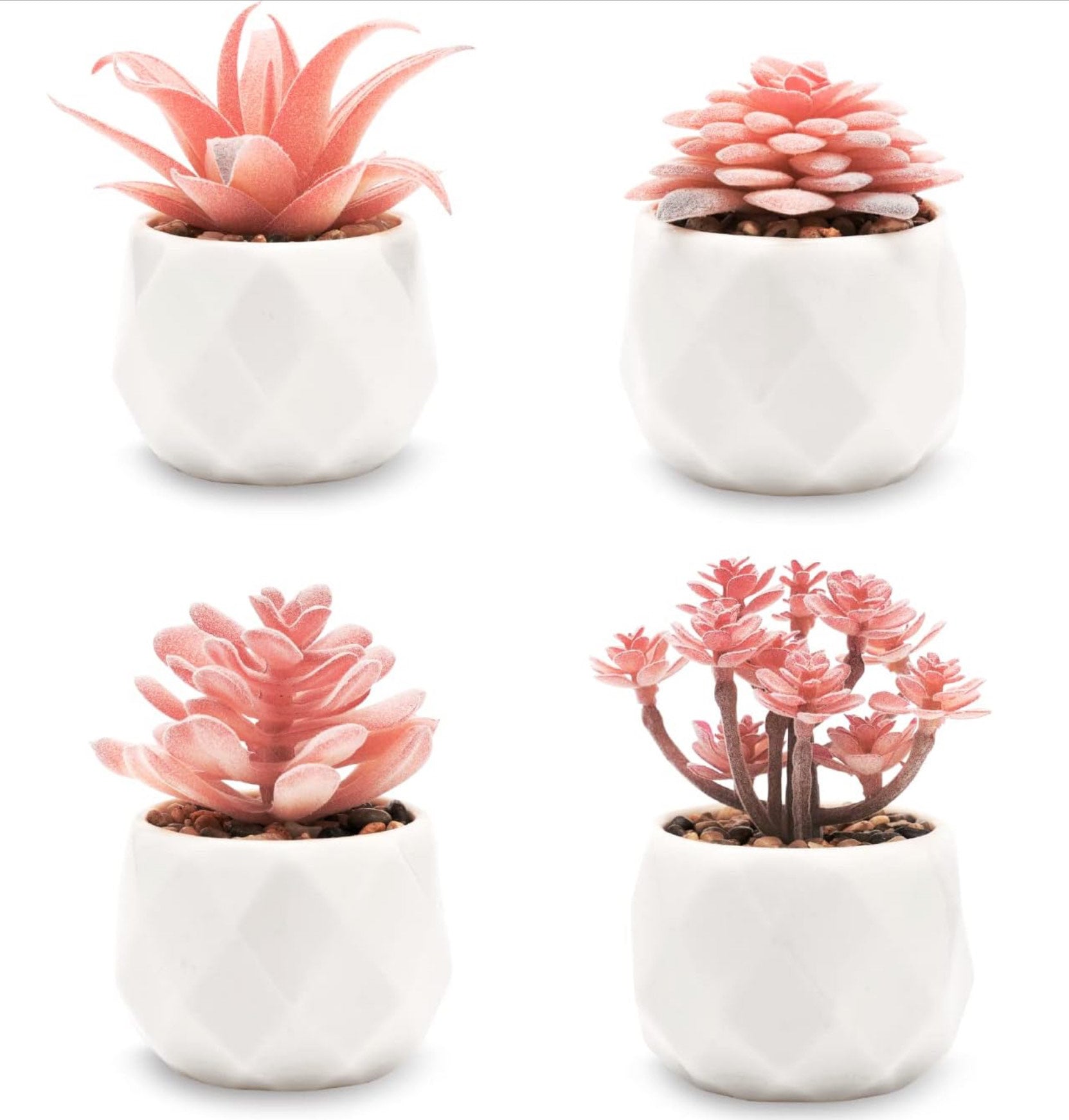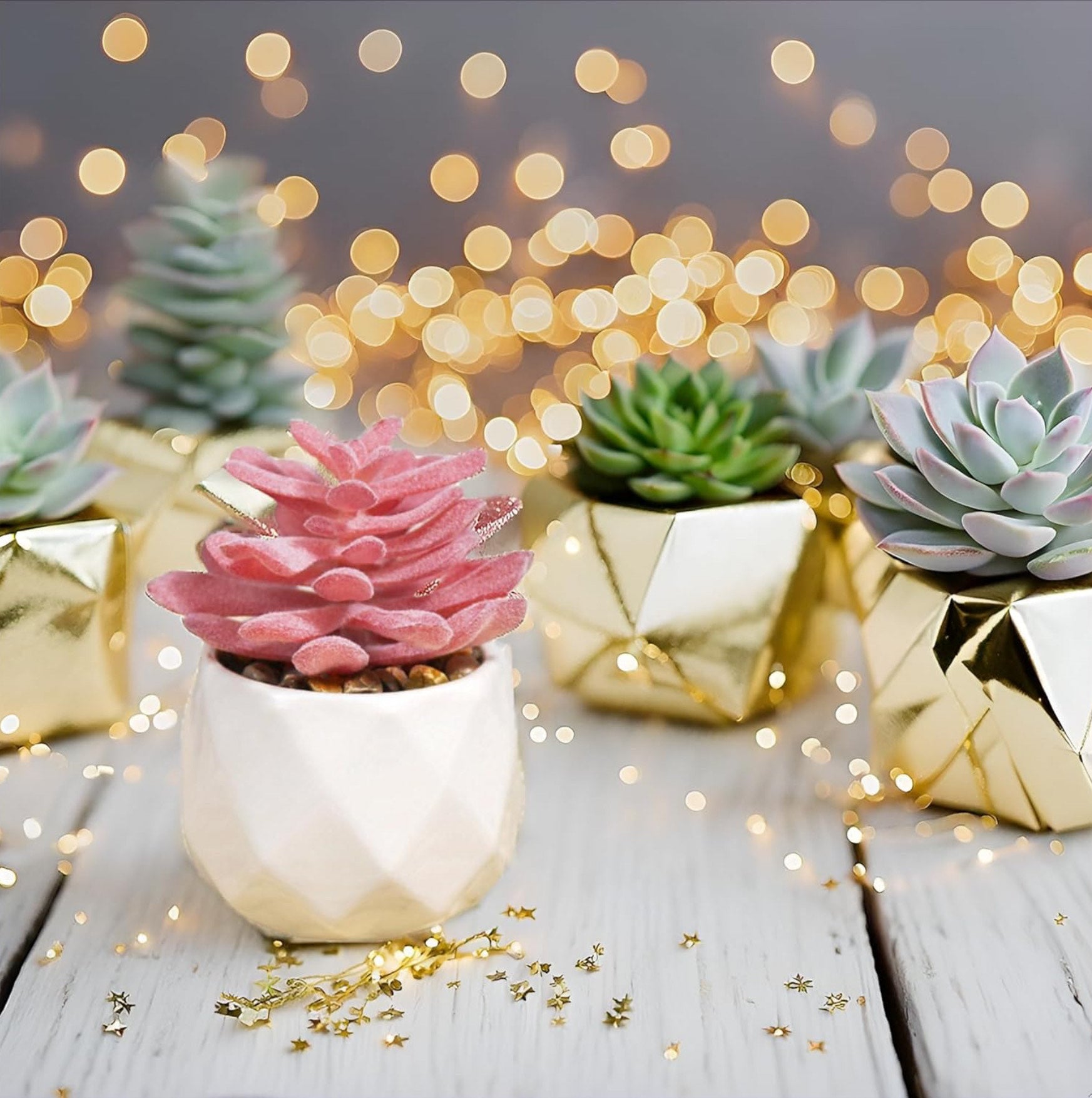 Add a pop of color and charm to any space with these lifelike pink succulents in sleek geometric pots. Perfectly sized and maintenance-free, they’re a stylish décor piece or a thoughtful, lasting gift for any occasion.