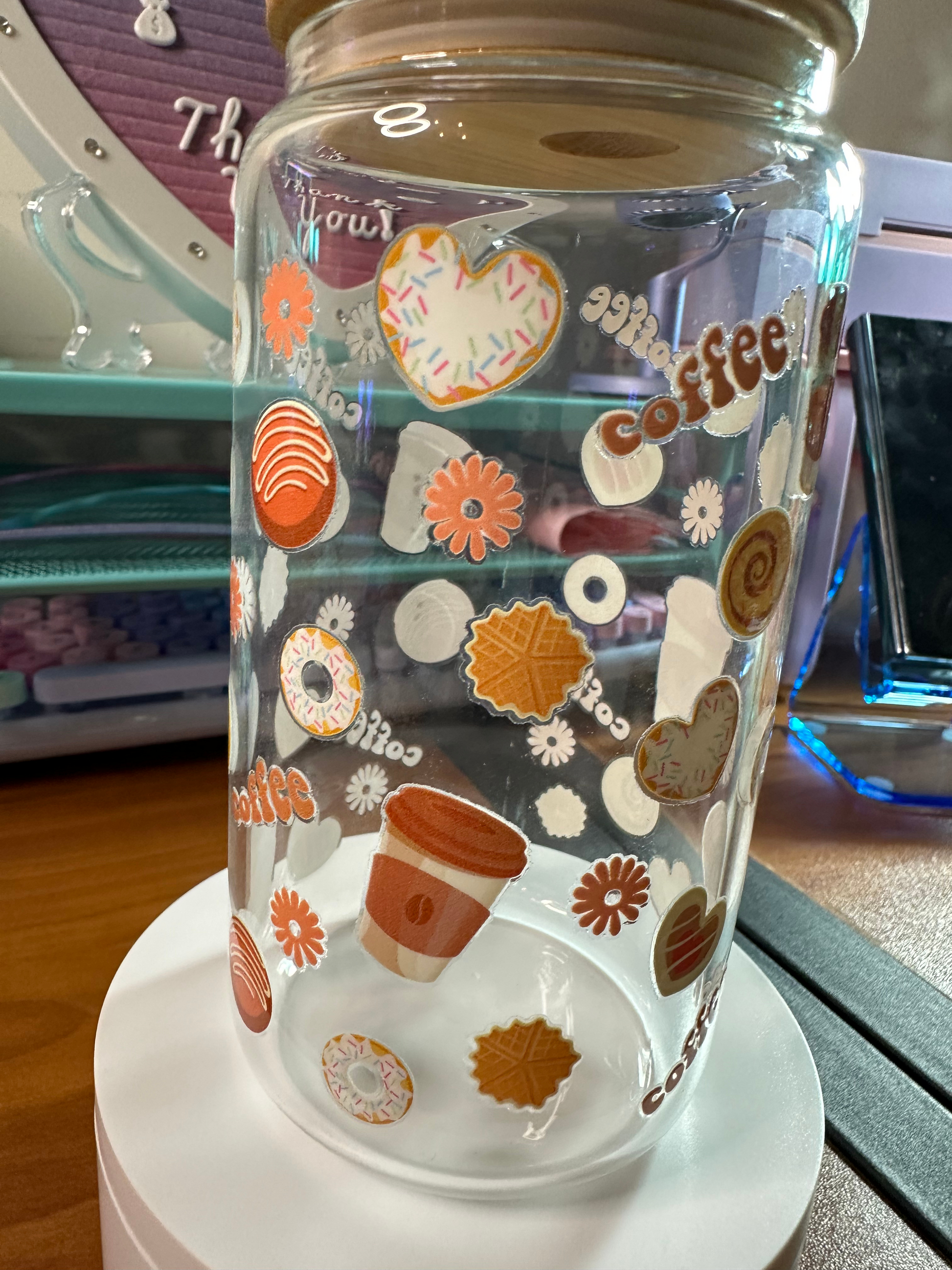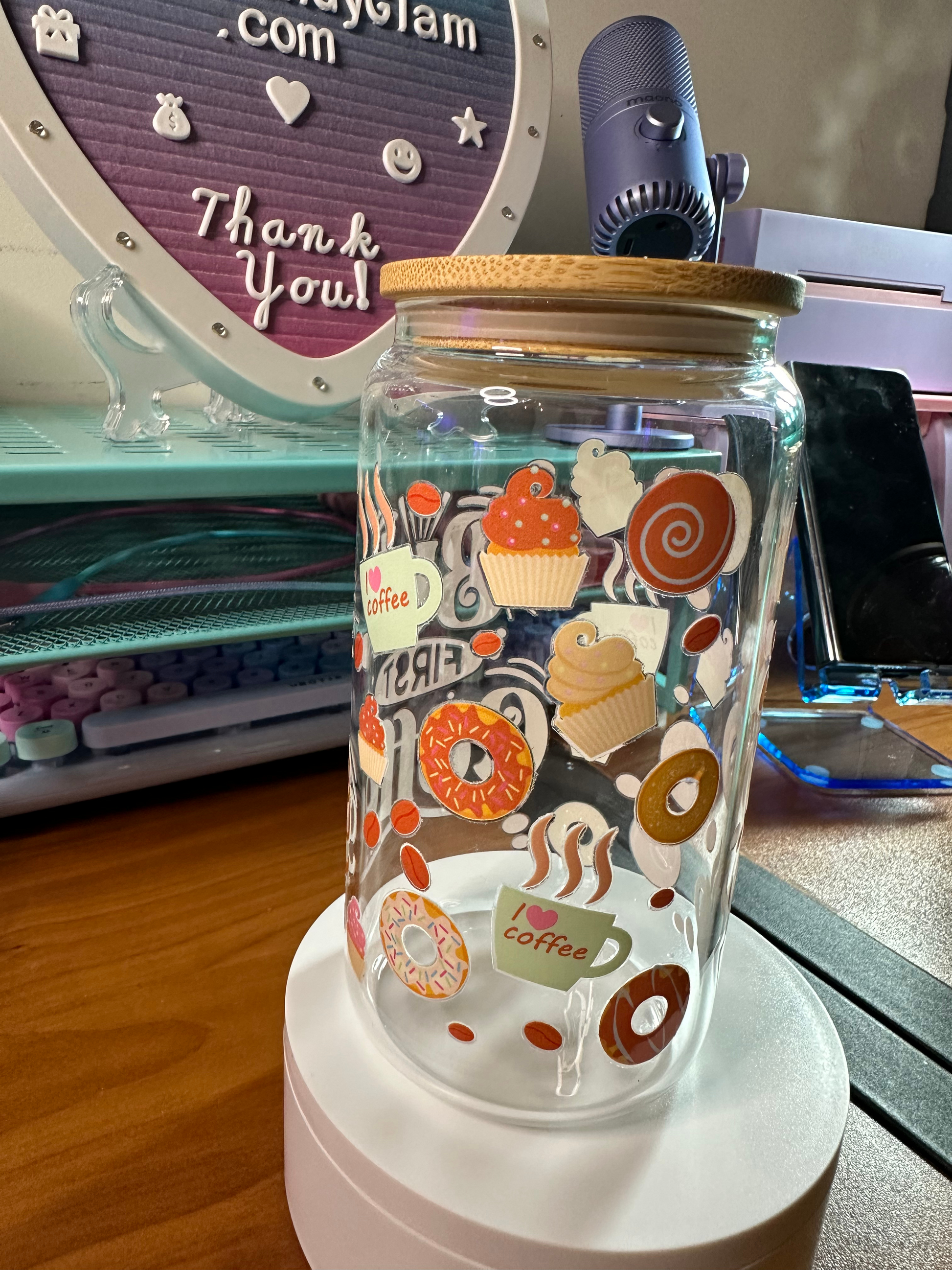The Sweet Coffeehouse Vibes Glass Cup is like stepping into your favorite cozy café! This adorable 16-ounce glass features a delightful design of steaming coffee cups, sweet treats, swirling patterns, and charming hearts, creating a warm and inviting vibe. Perfect for sipping your morning latte, afternoon iced coffee, or any favorite drink, this cup will make every sip feel like a mini escape to a coffee shop. Complete with a bamboo lid and glass straw, it’s both stylish and practical. The design is applied using a high-quality UVDTF transfer, making it durable, waterproof, and ready to withstand your everyday coffee runs!